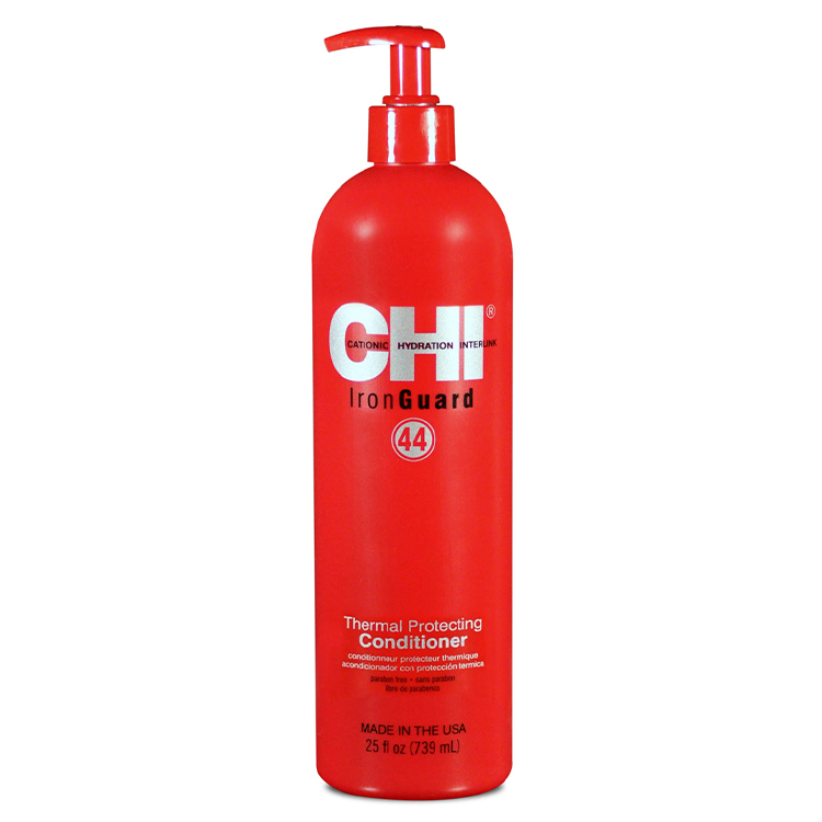 44 Iron Guard Thermal Protecting Conditioner hrănește părul, îl face ușor de manevrat și mătăsos datorită uleiului de jojoba, mătase și proteine. Oferă strălucire, prevenind deshidratarea firului, datorită prezenței vitaminelor A și E în compoziție. Închide cuticula și protejează împotriva deteriorării în timpul utilizării instrumentelor fierbinți.