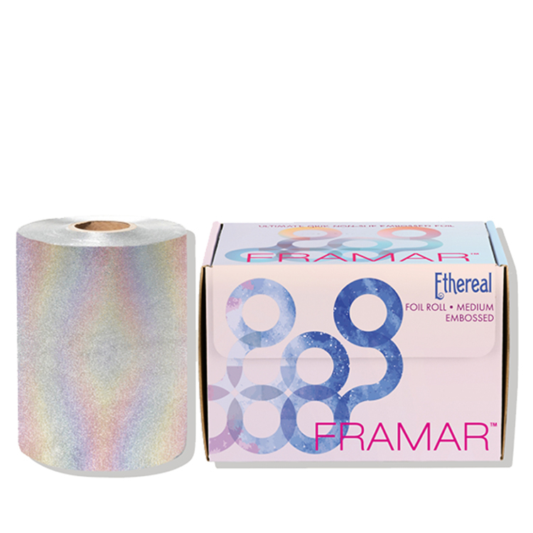 Folie în rulou Framar Embossed Roll Ethereal cu gofrare 98 m - folie profesională pentru stiliști cu print color potrivită pentru toate tehnicile de vopsire a părului care necesită utilizarea foliei. Ambalajul ergonomic vă permite să măsurați și să tăiați rapid și precis folie de orice lungime. Gofrarea crește fiabilitatea fixării foliei și previne alunecarea acesteia.