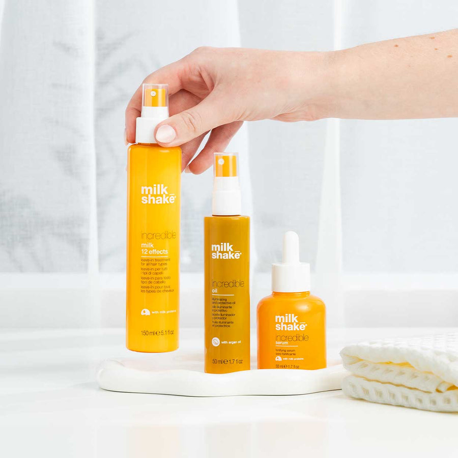milk_shake Incredible Milk livrează instant rezultate uimitoare. Transformă părul cu un amestec de ingrediente naturale ce includ unt de Muru Muru organic. Oferă 12 beneficii pentru păr: 1. tratament pentru toate tipurile de păr 2. efect anti-frizz 3. previne despicarea vârfurilor 4. termo protecție 5. menține coafura timp îndelungat 6. descâlcește firele de păr 7. oferă strălucire 8. conferă ținută și volum 9. facilitează utilizarea plăcii 10. protejează și menține culoarea 11. oferă protecție solară UV 12. netezește cuticula Milk_shake Incredible Milk funcționează cel mai bine atunci când este combinat cu șamponul și tratamentul potrivit tipului dvs. de păr.